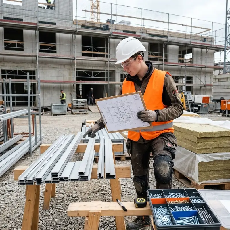 "description": "Du prüfst den Montageplan und stellst auf der Baustelle die passenden Fassadenprofile, Schrauben und Dämmplatten bereit.",