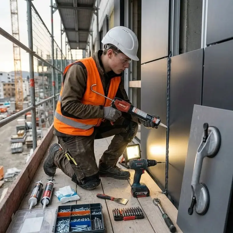 "description": "Du trägst Dichtmasse mit der Kartuschenpistole auf und verschraubst die Fassadenelemente am Gebäude.",