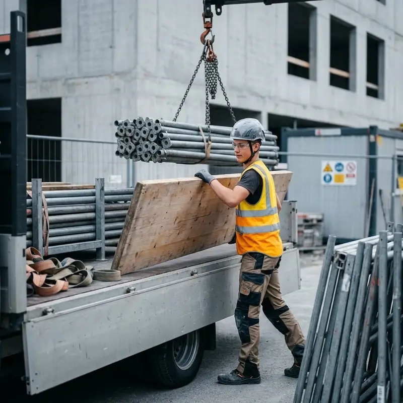 "description": "Du lädst Stangen, Rahmen und Bohlen mit dem Kran oder von Hand auf den Transporter auf der Baustelle.",