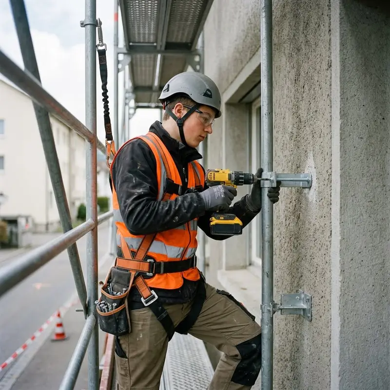 "description": "Du befestigst das Gerüst mit Ankern und Schrauben an der Fassade, damit es stabil steht.",