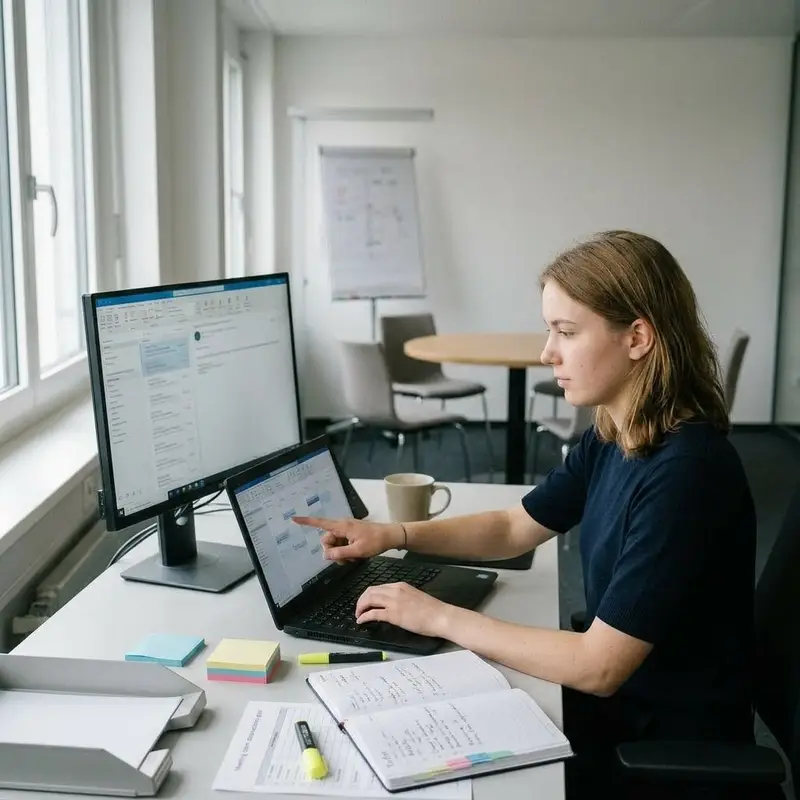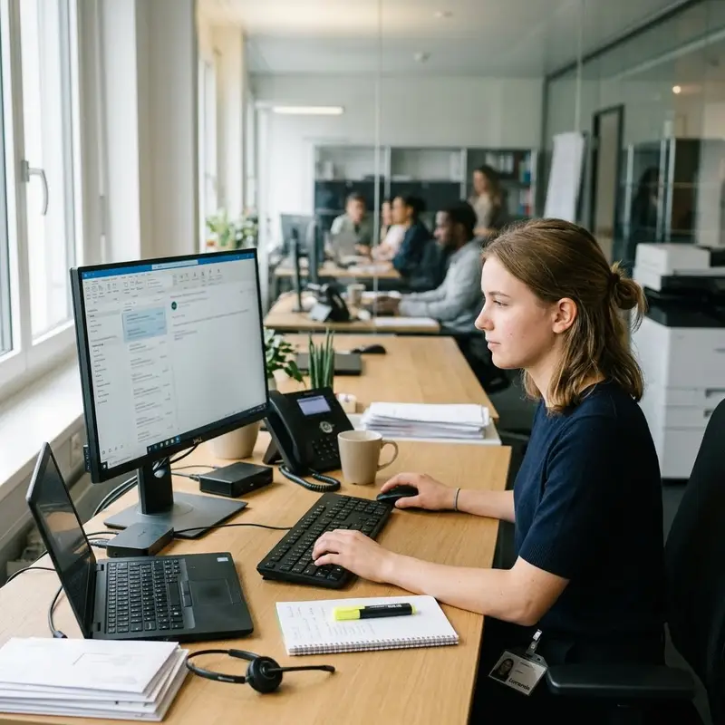 "description": "Du liest E-Mails am Computer im Büro, beantwortest Anfragen und leitest Nachrichten an die richtigen Personen weiter.",
