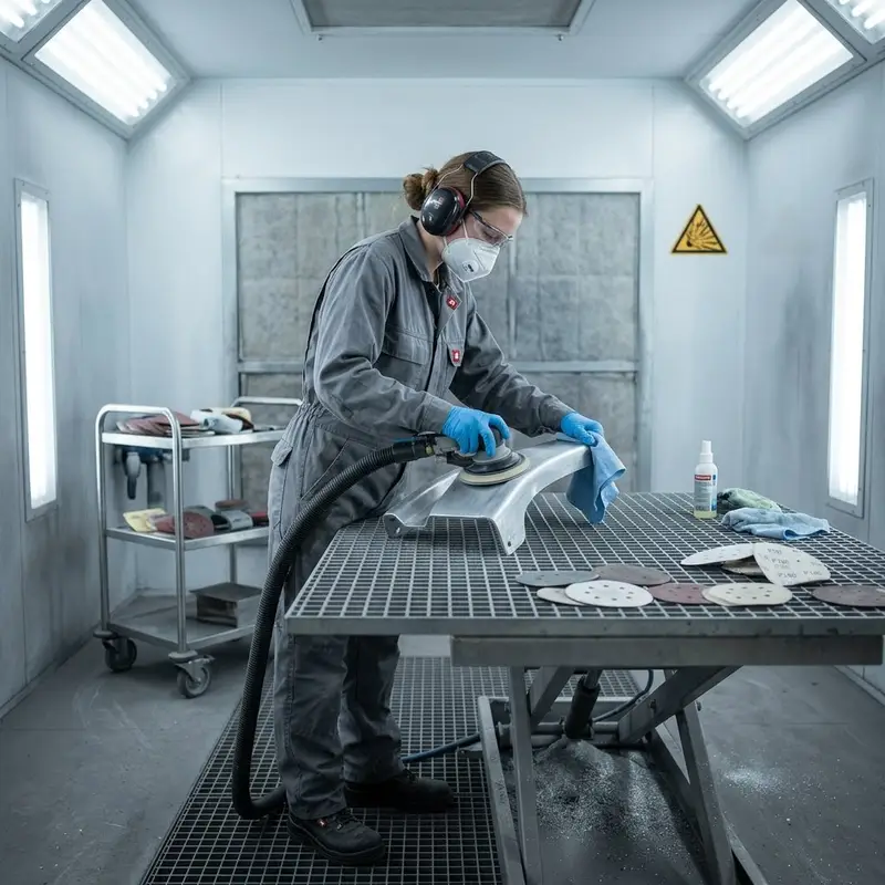 "description": "Du reinigst ein Metallteil in der Lackierkabine und schleifst es mit Schleifpapier und Maschine glatt.",