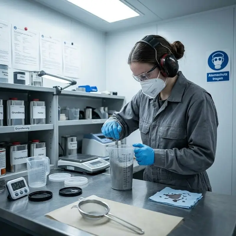 "description": "Du mischst Grundierung und Härter im Mischraum im Messbecher an und rührst die Mischung mit einem Rührstab.",