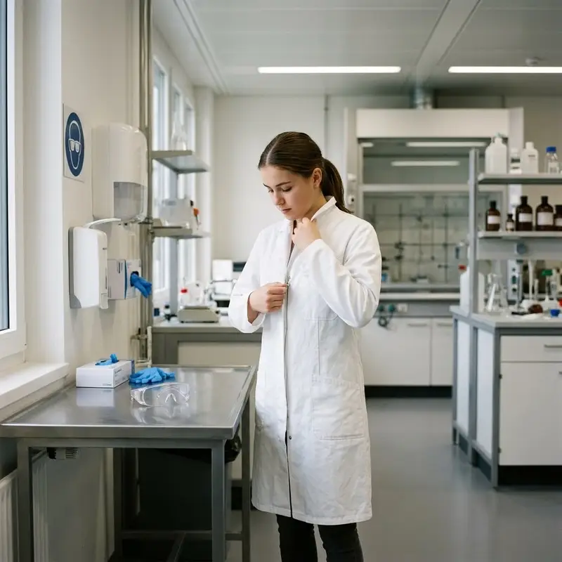 "description": "Du ziehst im Labor Kittel, Schutzbrille und Handschuhe an, bevor du an den Arbeitsplatz gehst.",