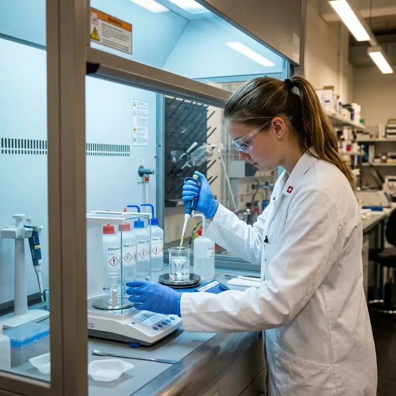 "description": "Du wiegst und pipettierst Chemikalien in Bechergläser und mischst die Lösung unter dem Abzug.",