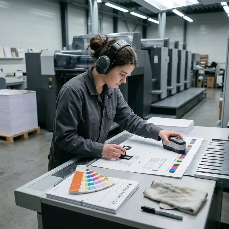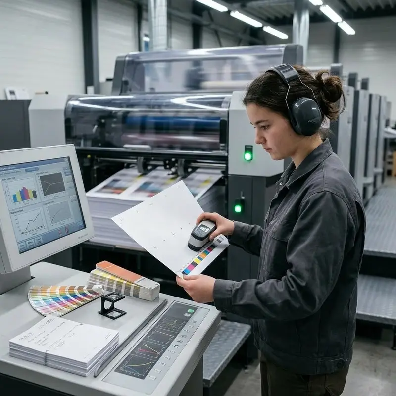 "description": "Du nimmst frisch gedruckte Bögen aus der Auslage und prüfst mit Lupe und Farbmessgerät die Qualität.",