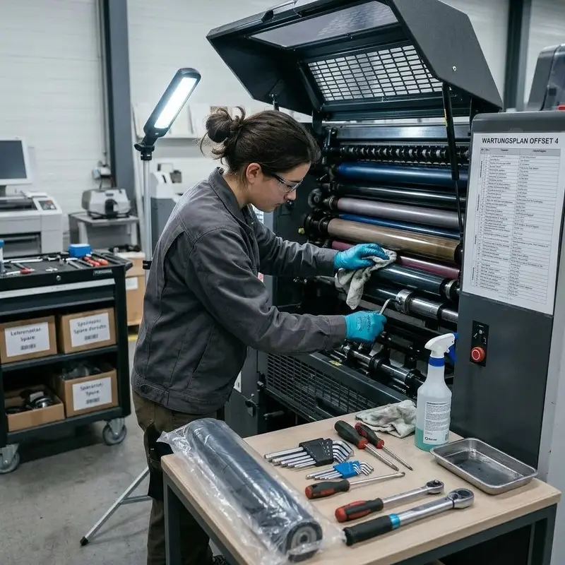 "description": "Du öffnest die Druckmaschine, reinigst Walzen und Bauteile mit Werkzeug und tauschst Verschleissteile in der Werkstatt aus.",