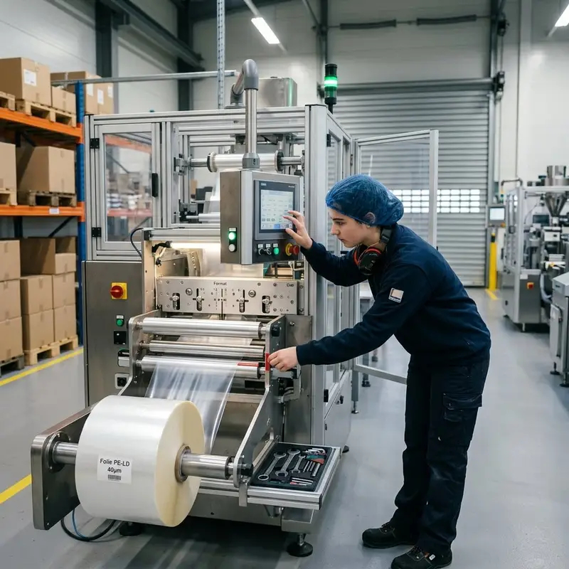 "description": "Du stellst an der Verpackungsmaschine Formate, Folienrollen und Parameter ein und startest die Produktion in der Halle.",