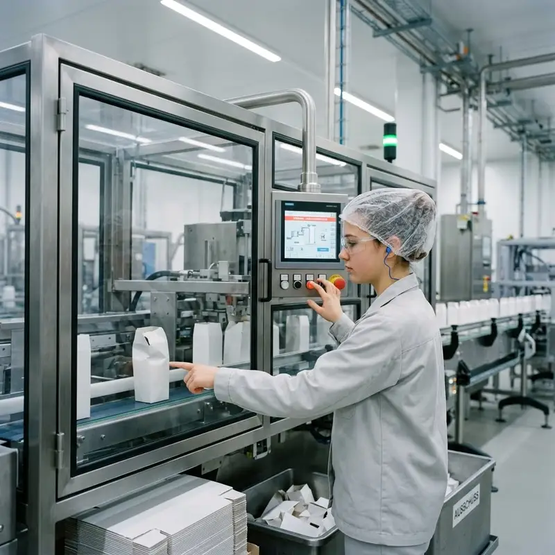 "description": "Du beobachtest an der laufenden Linie, wie Packungen geformt, befüllt und verschlossen werden, und greifst bei Störungen am Bedienpanel ein.",