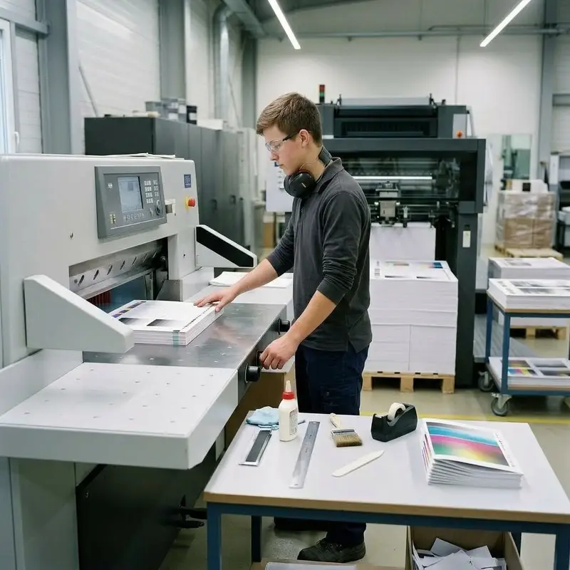 "description": "Du schneidest die gedruckten Bögen an der Schneidemaschine zurecht und klebst sie am Arbeitstisch zu fertigen Produkten zusammen.",