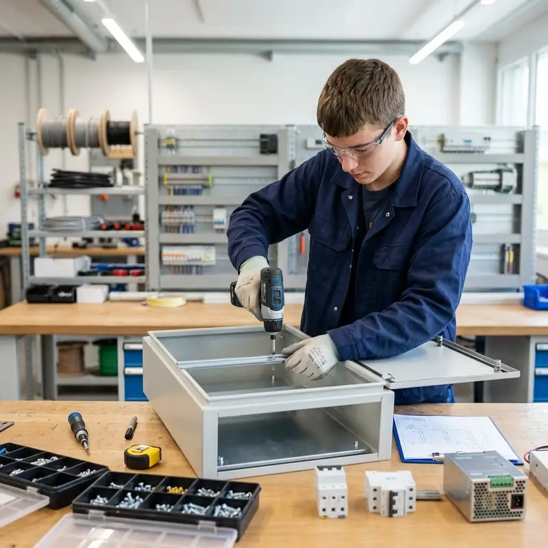 "description": "Du montierst Baugruppen und Schaltschränke aus Profilen, Hutschienen und Geräten in der Werkstatt zusammen.",