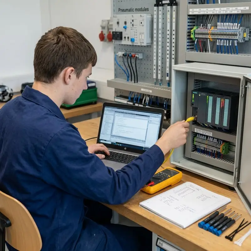 "description": "Du programmierst eine SPS am Laptop und lädst das Programm über ein Programmierkabel in die Maschine.",