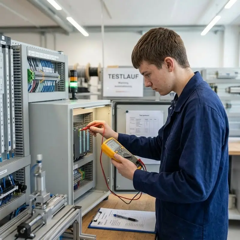"description": "Du prüfst die Anlage mit Messgerät und Testlauf, beobachtest Anzeigen und misst Signale an Messpunkten.",