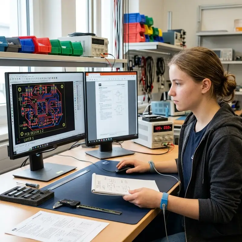 "description": "Du entwirfst am Computer einen Schaltplan und ein Leiterplatten-Layout für ein neues Gerät im Entwicklungsbüro.",