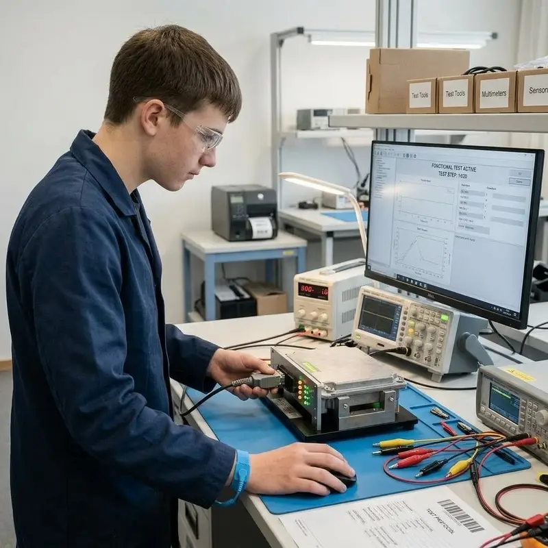 "description": "Du schliesst das fertige Gerät an ein Prüfsetup im Testlabor an und führst einen Funktionstest mit Testprogramm durch.",