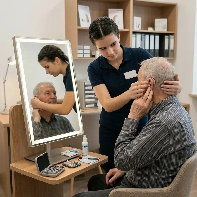 "description": "Du setzt deinem Kunden das Hörgerät am Ohr ein und überprüfst im Spiegel, ob es bequem sitzt und sicher hält.",