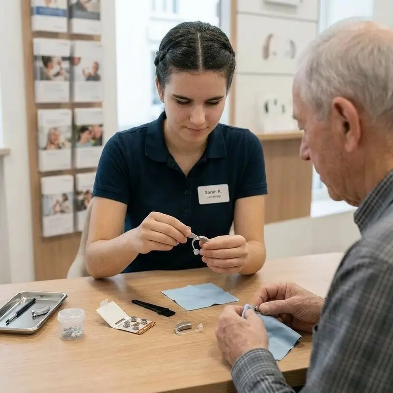 "description": "Du zeigst deinem Kunden am Beratungstisch, wie er Batterie oder Akku wechselt und das Hörgerät mit Bürstchen und Tuch reinigt.",
