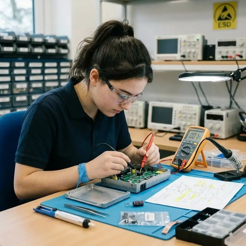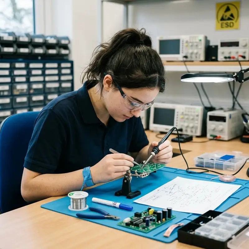 "description": "Du baust nach einem Schaltplan eine Leiterplatte auf und lötest Bauteile an der Werkbank.",