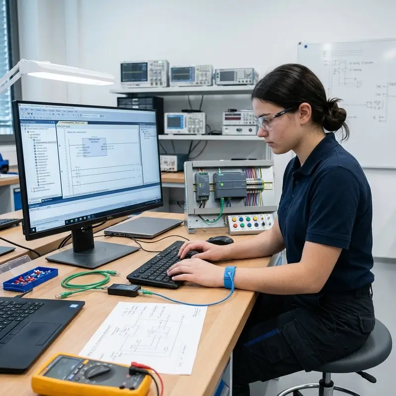"description": "Du programmierst eine Steuerung am Computer und spielst die Software über ein Programmiergerät auf die Hardware im Labor.",