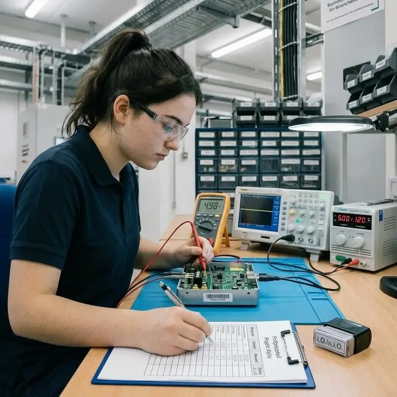 "description": "Du testest das Gerät am Prüfstand mit Messinstrumenten und trägst die Ergebnisse in ein Prüfprotokoll am Arbeitsplatz ein.",