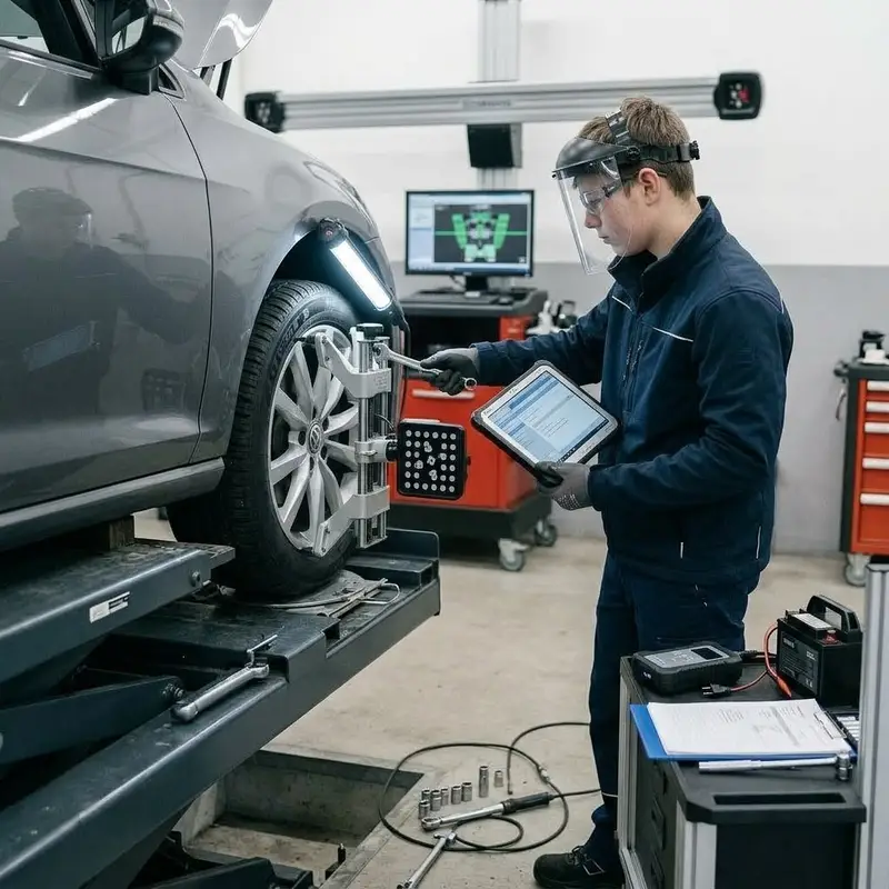 "description": "Du programmierst die Fahrzeugelektronik neu und stellst Bremsen oder Lenkung mit Messgerät und Werkzeug präzise ein.",
