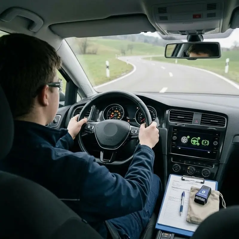 "description": "Du fährst nach der Reparatur eine Probefahrt auf der Strasse und prüfst dabei Bremsen, Lenkung und Warnanzeigen.",