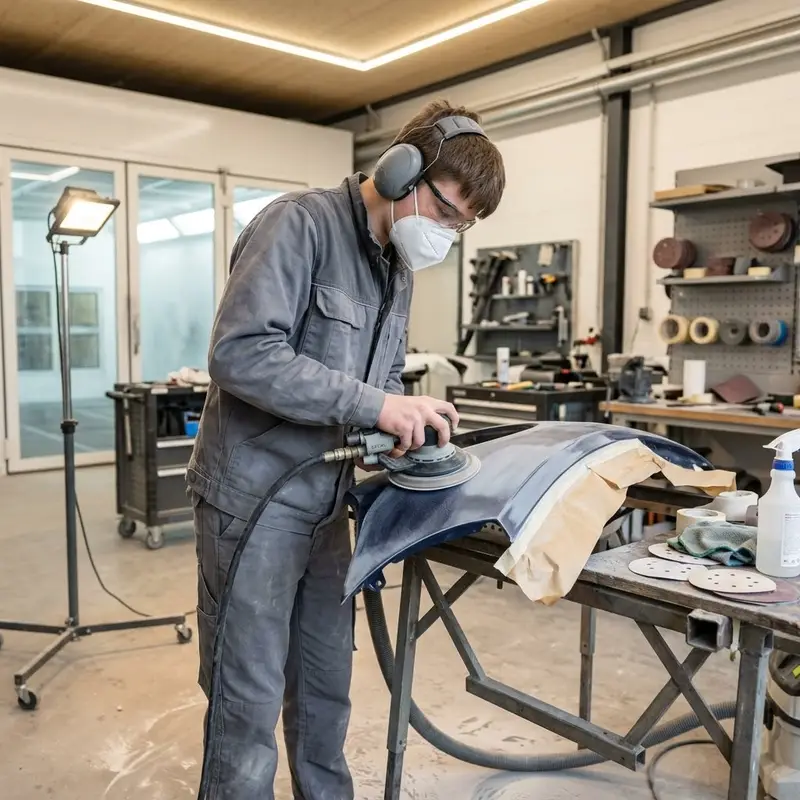 "description": "Du schleifst die Fahrzeugkarosserie mit Schleifmaschine und Schleifpapier in der Werkstatt glatt.",