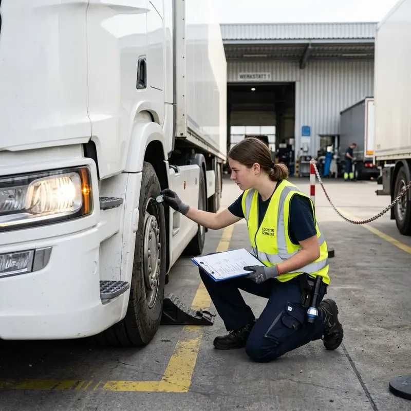 "description": "Du kontrollierst Reifen, Lichter und Bremsen am stehenden LKW auf dem Betriebshof.",