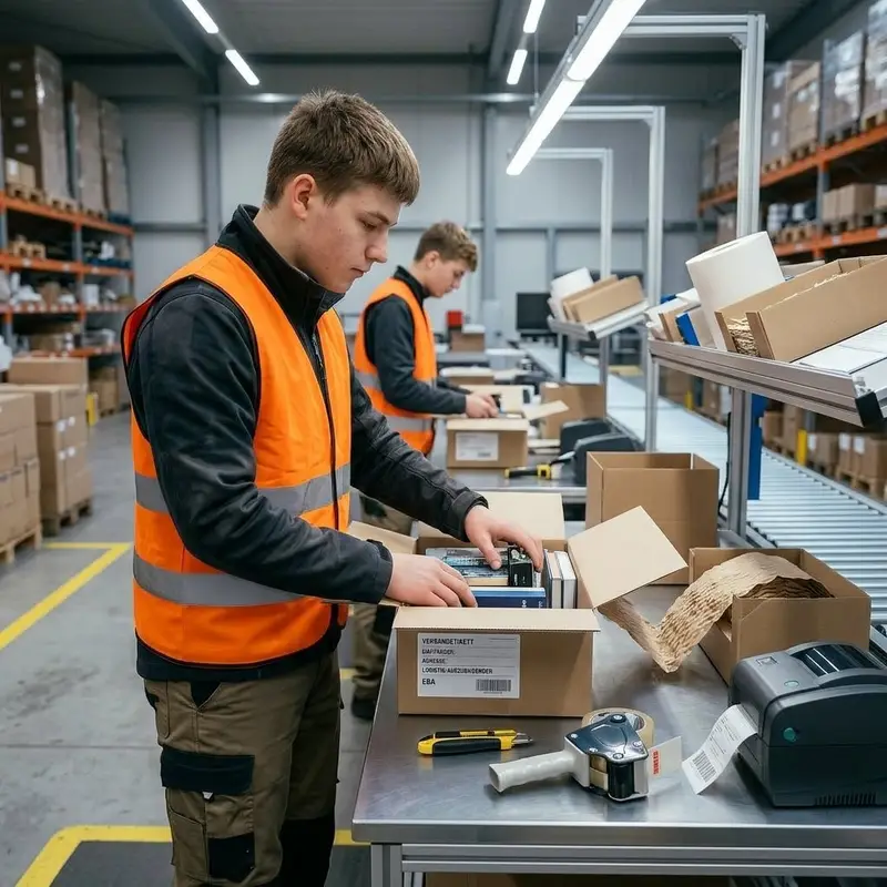 "description": "Du packst kommissionierte Waren in Kartons, füllst Polstermaterial nach und klebst Versandetiketten auf.",