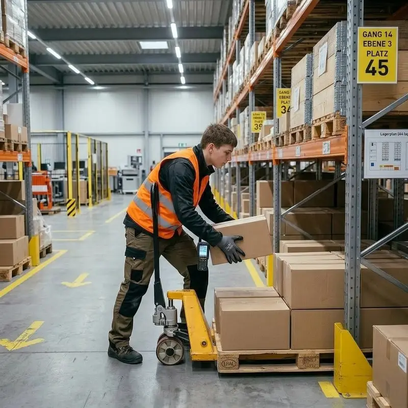 "description": "Du fährst mit dem Hubwagen zur Lagerzone und stellst die Ware in die richtigen Regalfächer.",