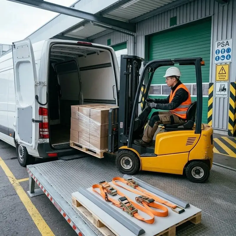 "description": "Du lädst Paletten mit dem Gabelstapler in einen Lieferwagen und sicherst die Ladung mit Spanngurten.",