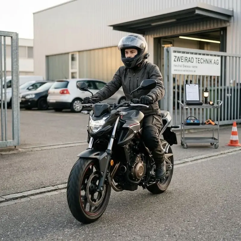 "description": "Du fährst das reparierte Motorrad auf der Strasse zur Probe und überprüfst danach in der Werkstatt Bremsen, Licht und Geräusche.",