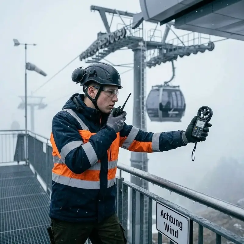 "description": "Du stehst draussen an der Station, prüfst Wind und Sicht mit Messgerät und entscheidest, ob die Seilbahn weiterläuft oder gestoppt wird.",