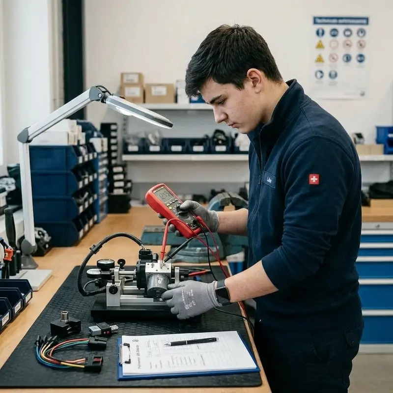 "description": "Du prüfst das ausgebaute Teil am Werkbank-Prüfstand mit Messgerät und kontrollierst, ob es noch sicher funktioniert.",