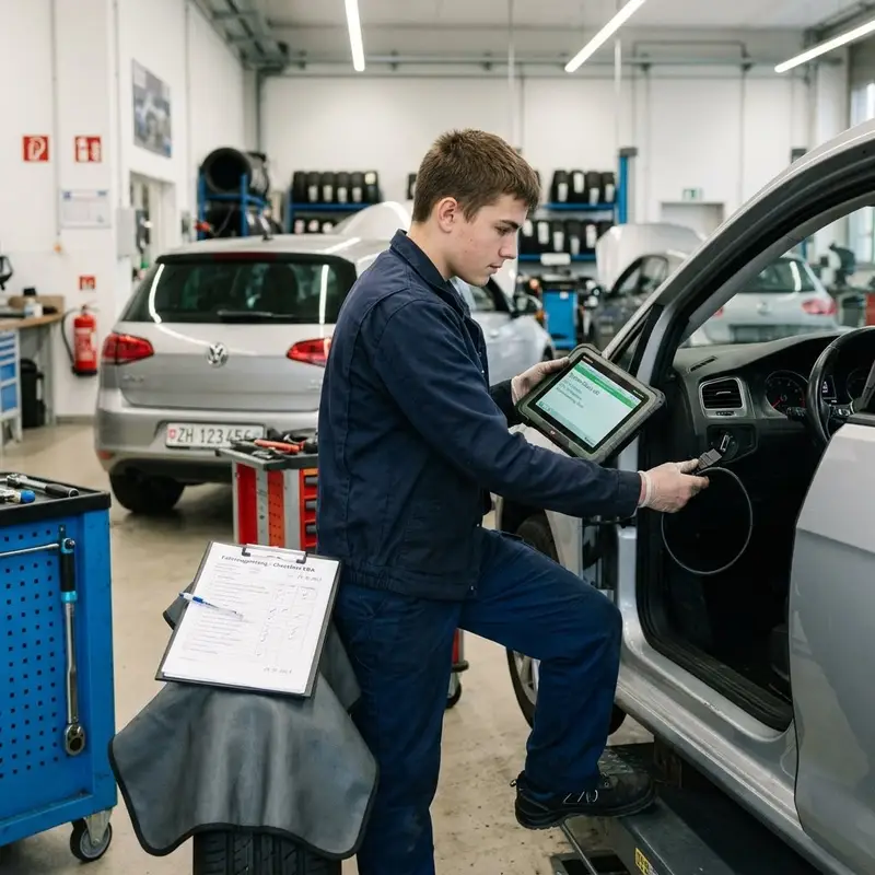 "description": "Du prüfst in der Werkstatt ein Auto mit Diagnosegerät und Checkliste auf Funktion und Sicherheit.",