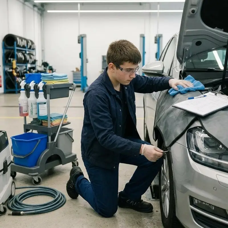 "description": "Du stellst nach der Reparatur die Bauteile korrekt ein und reinigst das Fahrzeug im Werkstattbereich.",