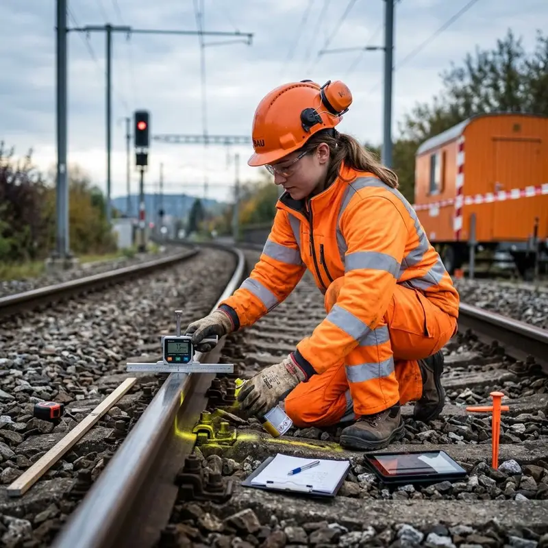 "description": "Du misst mit Messgerät und Markierungen die Lage und Höhe der Gleise draussen entlang der Strecke.",