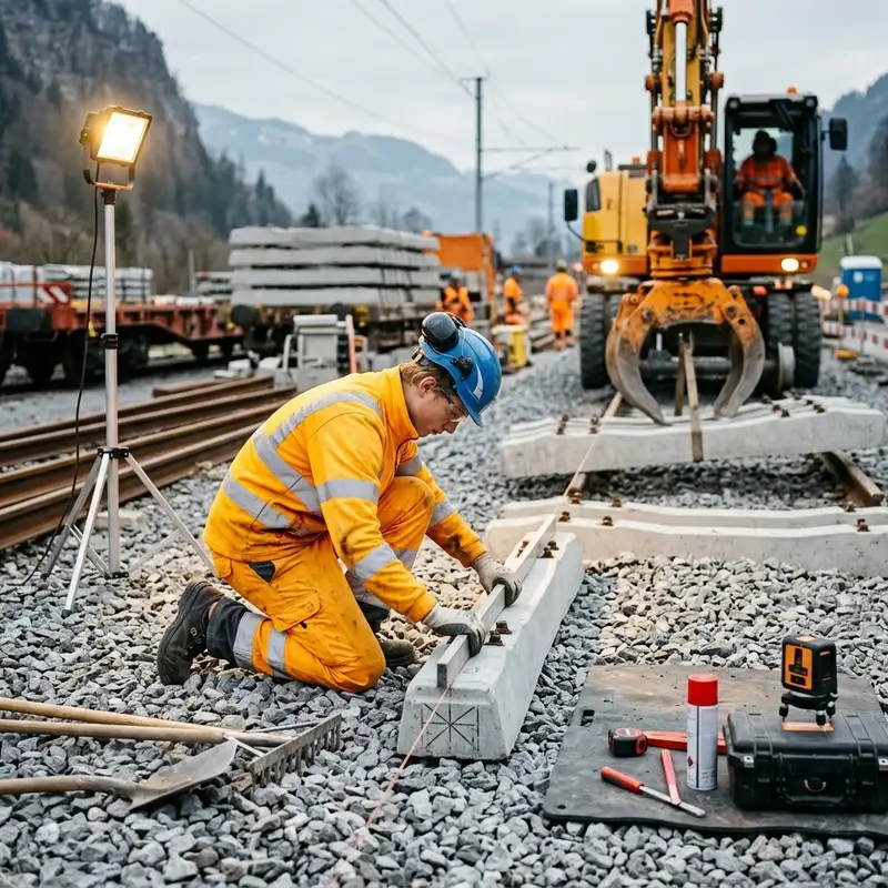 "description": "Du verlegst Schotter, Schwellen und Schienen mit Werkzeug und Maschine auf einer Gleisbaustelle.",