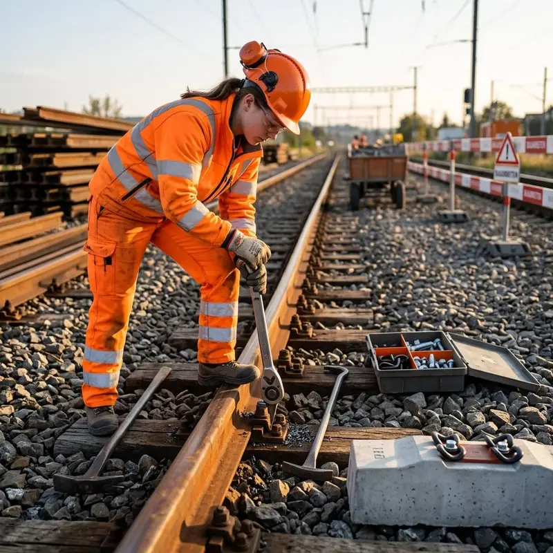 "description": "Du baust alte Schienen und Schwellen mit Brechstange und Schraubwerkzeug aus und setzt neue Teile ein.",