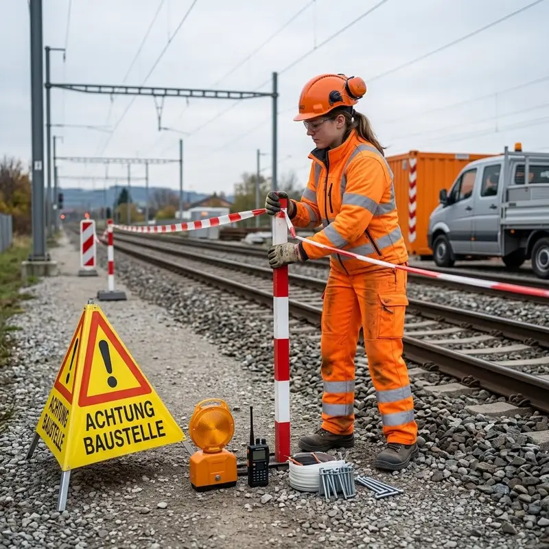 "description": "Du stellst Warnschilder, Absperrbänder und Signale auf, damit die Gleisbaustelle sicher abgegrenzt ist.",