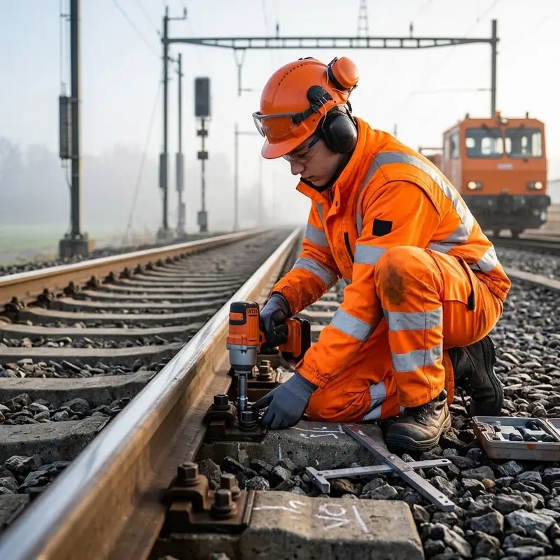 "description": "Du gehst die Strecke ab, prüfst Schienen und Befestigungen und ziehst lockere Schrauben mit dem Schlagschrauber nach.",