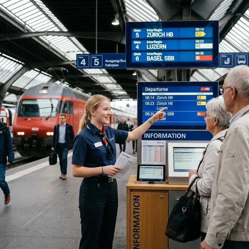 "description": "Du stehst am Schalter oder auf dem Perron und erklärst Fahrgästen mit Fahrplananzeige und Tarifinfos die beste Verbindung.",