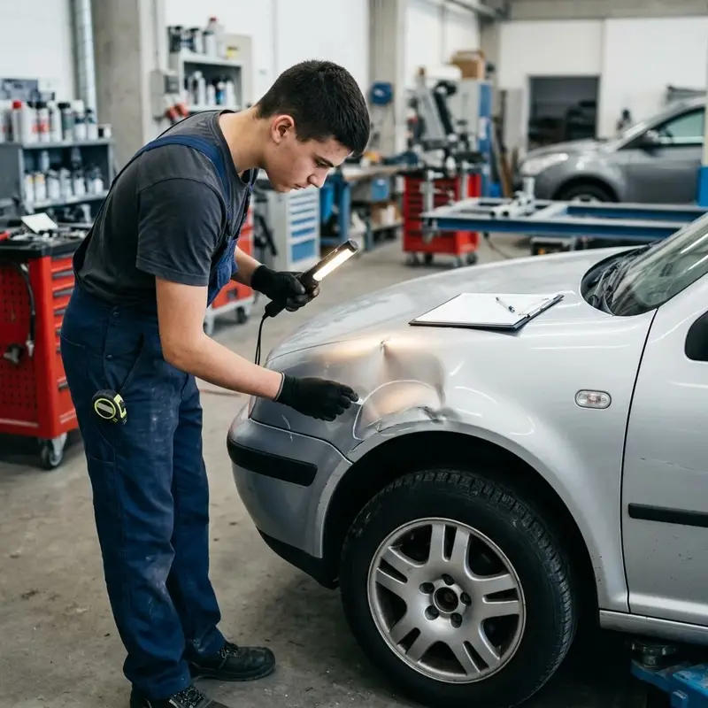 "description": "Du begutachtest das Unfallfahrzeug in der Werkstatt und markierst die beschädigten Stellen am Blech mit einer Lampe und Kreide.",