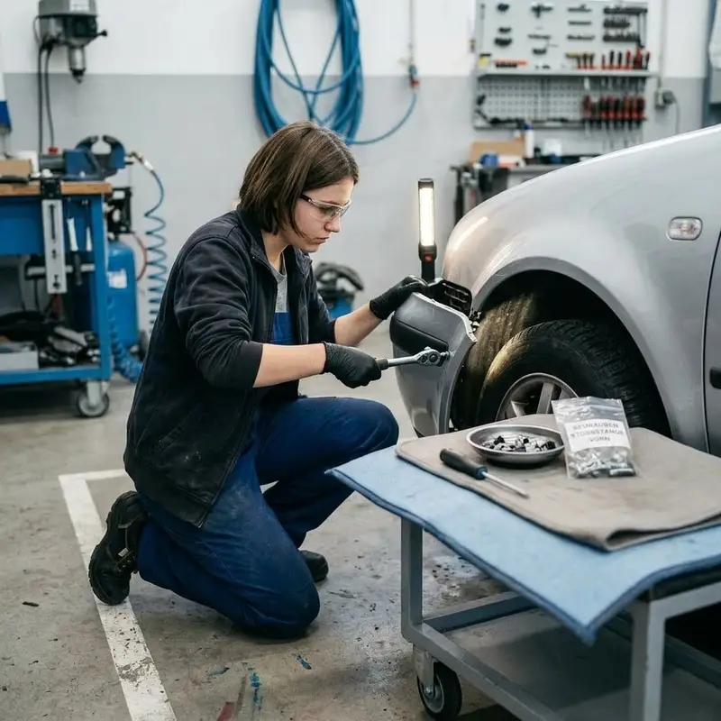 "description": "Du montierst das reparierte oder neue Karosserieteil wieder an das Fahrzeug, richtest die Spaltmasse aus und ziehst die Schrauben fest.",