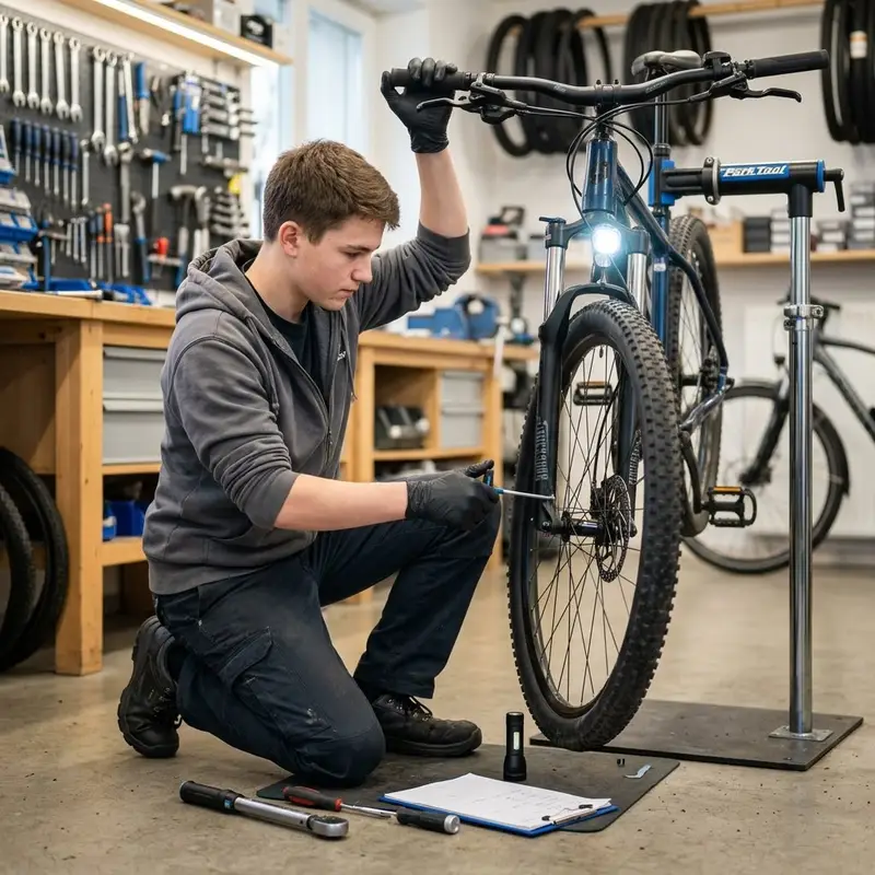 "description": "Du prüfst in der Werkstatt die Bremsen und Lichter am Fahrrad oder Mofa und stellst sie mit Werkzeug korrekt ein.",
