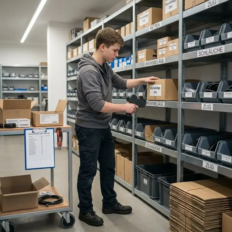 "description": "Du sortierst im Lager Kartons mit Ersatzteilen in Regale, beschriftest die Fächer und räumst den Arbeitsplatz danach auf.",