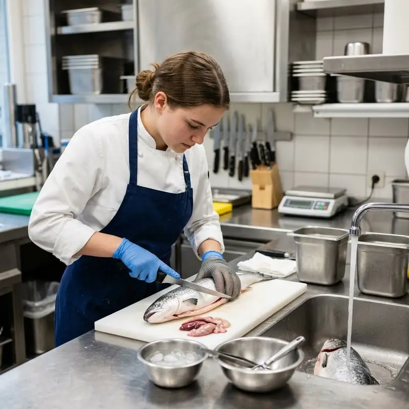"description": "Du nimmst einen Fisch am Edelstahl-Arbeitstisch aus, entfernst die Innereien mit dem Messer und spülst ihn im Waschbecken sauber.",