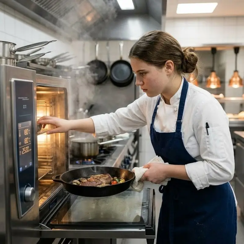 "description": "Du brätst ein Gericht in der Pfanne an, schiebst es in den heissen Ofen und kontrollierst Garzeit und Temperatur am Ofenpanel.",