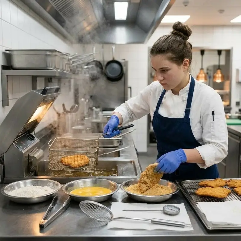 "description": "Du panierst Schnitzel in Mehl, Ei und Paniermehl und frittierst sie danach im heissen Öl in der Fritteuse goldbraun.",