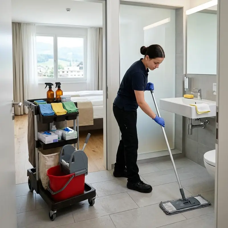 "description": "Du reinigst ein Hotelzimmer mit Putzwagen und Reinigungsmitteln und wischst Bad und Boden gründlich.",